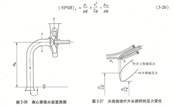 離心泵的吸水裝置在水泵運行時,由于葉輪高速旋轉(zhuǎn),在其入口處形成了真空,進水池中的水流在大氣壓的作用下經(jīng)過吸水管流至水泵進口,再從泵進口流入葉輪流道,壓力沿水流減小,到進入葉輪后,在葉片背面(即背水面)水流以相對速度W1,繞流葉片進口邊,由于急轉(zhuǎn)彎,流速加大,在葉片背面靠進口的K點處壓力降到低值,K點是水泵內(nèi)容易產(chǎn)生汽蝕的點,如圖3-27所示。水泵是否會產(chǎn)生汽蝕,取決于K點處的壓力值,當K點的壓力pk下降到等于該泵工作溫度下的飽和汽化壓力p汽時,則泵內(nèi)發(fā)生汽蝕。以后,水流在葉輪中得到葉片傳來的機械能,壓力迅速上升,因此汔蝕基本方程正是表征水泵汽蝕條件與影響汽蝕諸因素之間的關系式,其表達式如下: