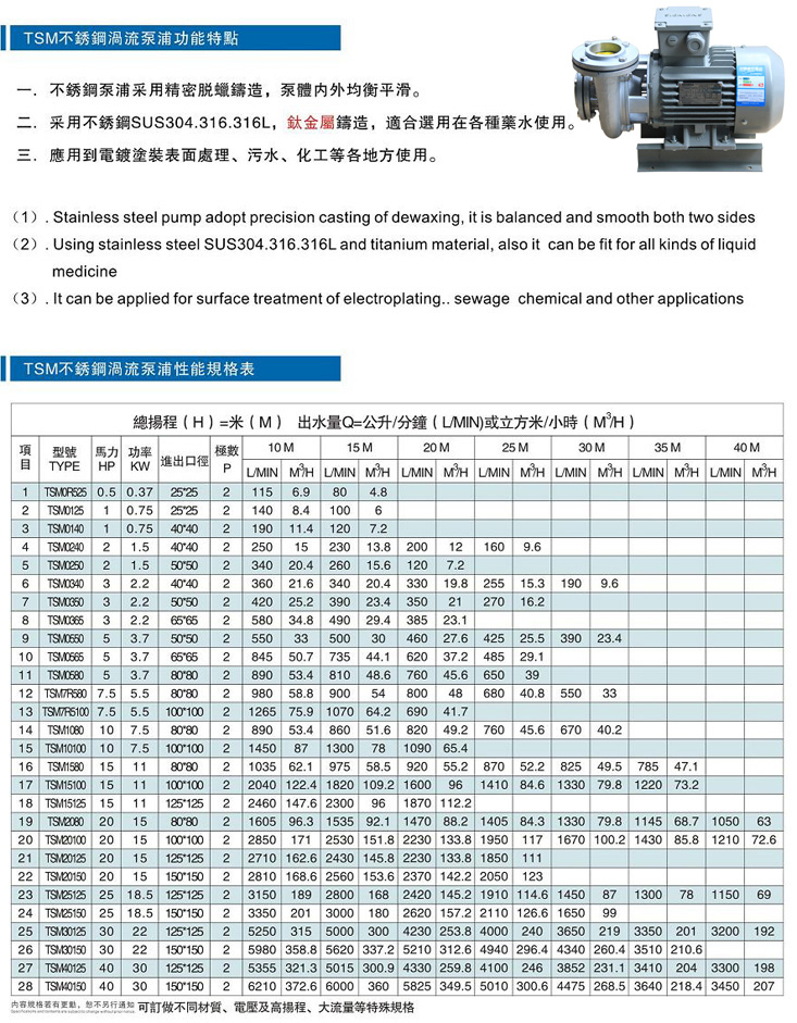 采用不銹鋼304/316精鑄而成,具有耐酸堿,耐高溫,耐磨等特點,應用于電鍍,涂裝,環保,化工等領域,又名污水泵,耐酸堿泵.可訂做防爆泵,二級能效泵,特殊電壓泵.